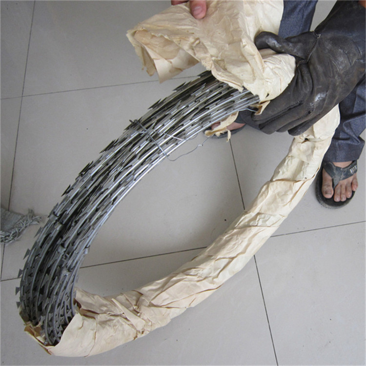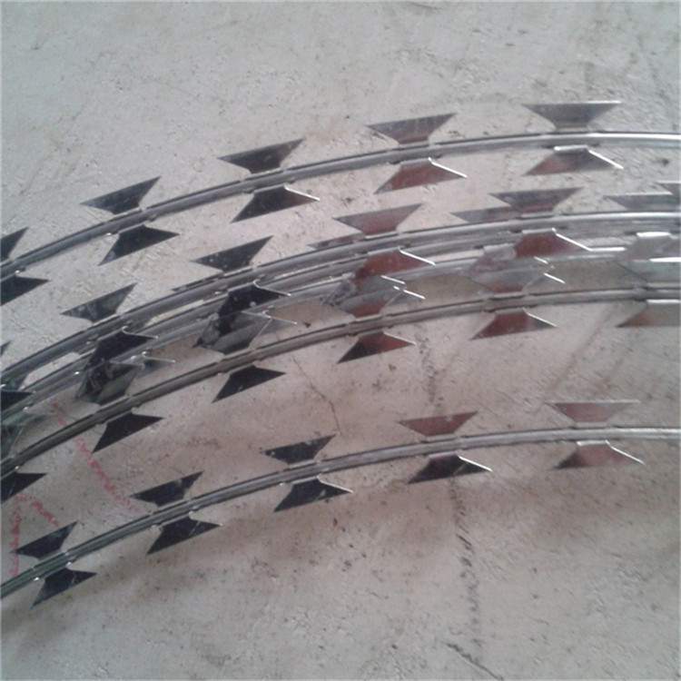 螺旋型交叉式刀片刺絲是在兩條刀片刺絲之間以不銹鋼片和鍍鋅鋼片強(qiáng)力夾和,展開后即成交叉狀,取其美觀又實用。