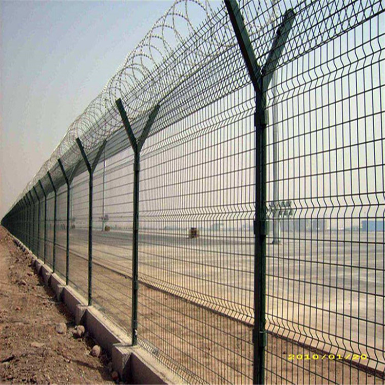 機場圍界又稱作“Y型安全防御護網(wǎng)”,是由V型支架立柱加強型焊接片網(wǎng),安全防盜連接件和熱鍍鋅刀片刺網(wǎng)組成強度和安全防御性級別很高。被廣泛應用在機場,軍事基地等高安全場所。