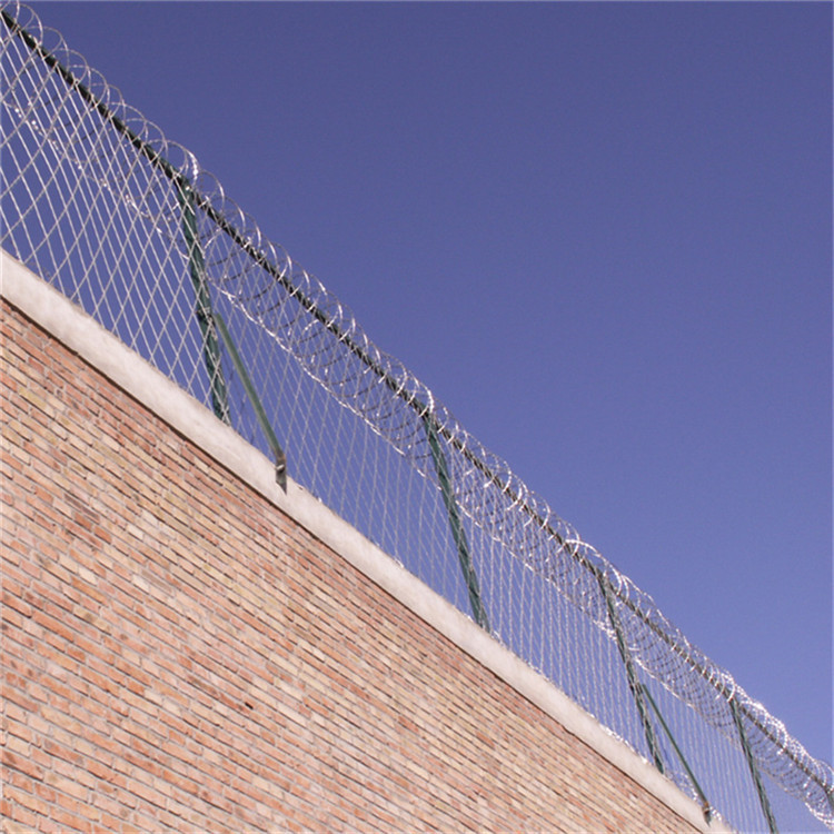 監(jiān)獄鋼網(wǎng)墻、看守所隔離網(wǎng)、機(jī)場圍界網(wǎng)等,大多在頂部用V型支架加裝監(jiān)獄專用不銹鋼刺刀圈,這種刺刀圈呈螺旋狀,一般多為不銹鋼材質(zhì),結(jié)構(gòu)新穎、堅(jiān)固緊密、網(wǎng)面平整、網(wǎng)孔均勻、刀鋒銳利、防攀爬、**腐蝕性強(qiáng)。