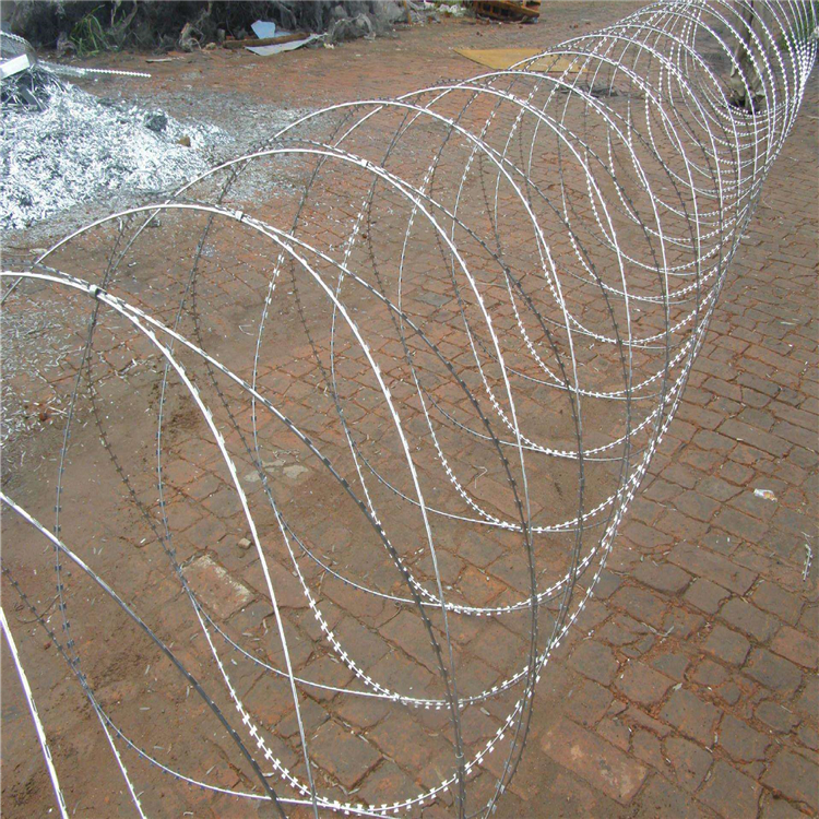 刺絲滾籠采用刀片刺繩繞圈后相鄰兩圈每隔120度用刺絲連接卡固定,張開后形成蛇腹網(wǎng)狀,閉合后刀片刺繩卷徑為50cm,張開后每交叉圈安裝間距20cm,直徑不小于45cm。