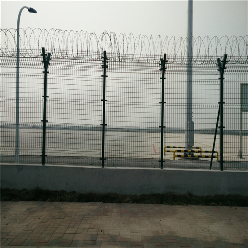 機(jī)場鋼筋圍界網(wǎng)頂部加裝刀片刺絲、刀片刺網(wǎng)后又很好的增強(qiáng)了安全防護(hù)性能。采用電鍍、熱鍍、噴塑、浸塑等防腐形式,具有很好的抗老化、抗曬、耐腐蝕等特點(diǎn)。其產(chǎn)品造型美觀、花色多樣,既起到圍欄作用,又起到美化作用。由于具有安全性高、防攀爬能力好,網(wǎng)片連接方式采用特制SBS緊扣件,有效防止人為的破壞性拆卸,橫向四道折彎加強(qiáng)筋,使網(wǎng)面強(qiáng)度顯著增加。