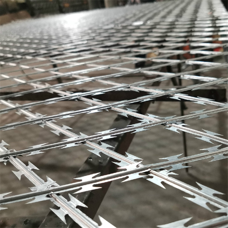 監(jiān)獄刀刺隔離網(wǎng)在防護領域變現(xiàn)突出,這主要源于其特殊的工藝。監(jiān)獄刀片焊接網(wǎng)是由蛇腹型刀片刺繩演變而來,鋒利的刀型刺交叉焊接形成網(wǎng)片,既美觀又讓人不寒而栗。起到了很好的阻嚇作用。同時該產(chǎn)品具有美觀、防阻效果好、施工便利等優(yōu)點。固定邊框與刀片焊接網(wǎng)通過兩邊方鋼焊接連接,刀片焊接網(wǎng)居于固定邊框中間線,兩連接方鋼與刀片焊接網(wǎng)焊接于固定邊框中央。監(jiān)獄刀片焊接網(wǎng)與網(wǎng)片固定框居中焊接,所有焊點與固定邊框滿焊連接,要求焊透率100%,焊點光滑牢固、片網(wǎng)平整。