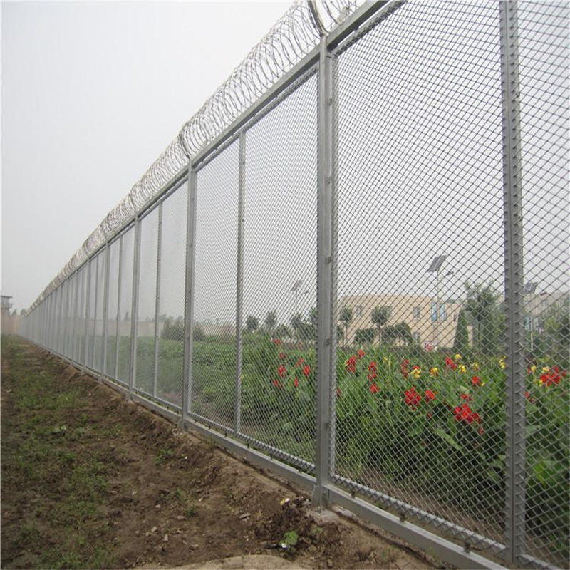 監(jiān)獄鋼網(wǎng)墻常見的一種是鋼板網(wǎng)式監(jiān)獄隔離網(wǎng),鋼板網(wǎng)式一張整板整體沖壓后制作成網(wǎng)片,然后焊接上邊框立柱,上邊架上刀片刺繩組合而成。監(jiān)獄鋼網(wǎng)墻護(hù)欄網(wǎng)相比較于普通焊接網(wǎng)片監(jiān)獄護(hù)欄網(wǎng),鋼板網(wǎng)的抗裁剪,不開焊,美觀等特點(diǎn)尤為突出。