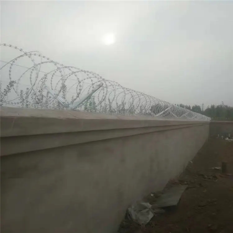 1、刀刺網(wǎng)立柱間距3m,邊框與立柱采用螺栓固定邊耳式連接,邊耳均為40mm*40mm*6mm扁鐵,邊耳螺孔可調(diào),調(diào)節(jié)距離不小于15mm;邊耳固定螺栓為直徑14mm*50mm全絲熱鍍鋅安全螺栓、螺母,每片網(wǎng)單邊連接點(diǎn)為6個以上。刀刺網(wǎng)設(shè)計要求整體連貫一致,框網(wǎng)方正,對角線誤差不大于2cm。