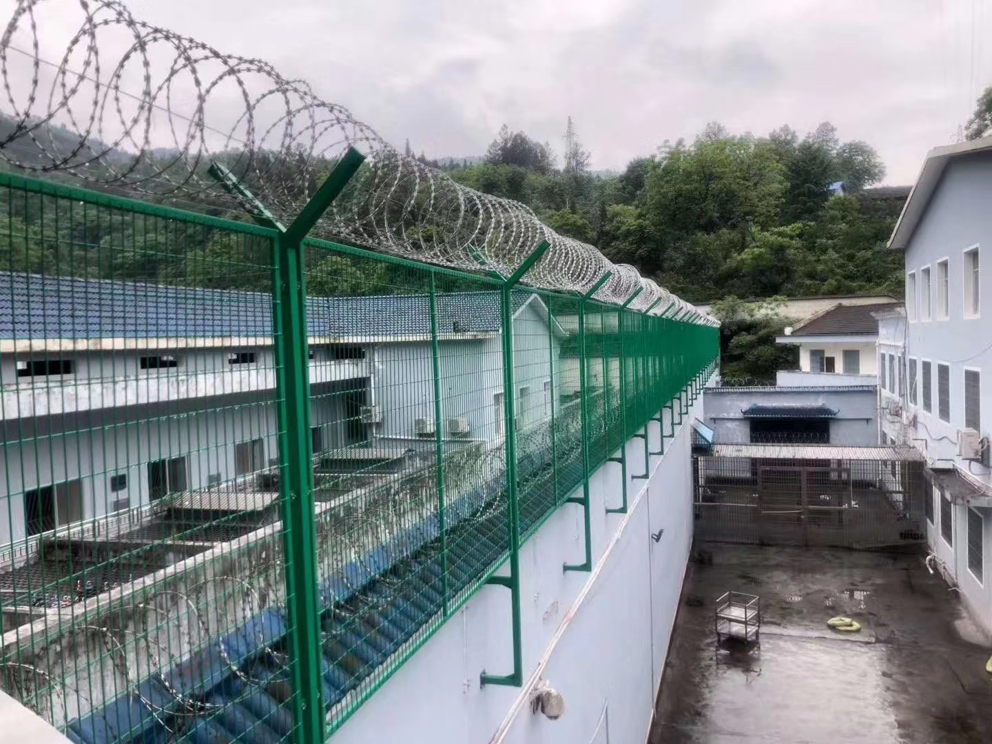 4、刀刺網(wǎng)每圈刀刺間隔100mm,每米刀刺不少于10圈。刀刺網(wǎng)安裝固定卡扣整體調(diào)正,使刀刺網(wǎng)不出現(xiàn)擰轉(zhuǎn)情況,刀刺刺圈分布均勻,每隔20米與拉絲固定;分段連接處需將兩端刀刺網(wǎng)做連接固定,刀刺網(wǎng)固定點(diǎn)需緊鎖不得,出現(xiàn)松動、脫落現(xiàn)象;刀刺網(wǎng)安裝與隔離網(wǎng)平行,上下左右均成直線延伸,轉(zhuǎn)角處需做加密加固處理。