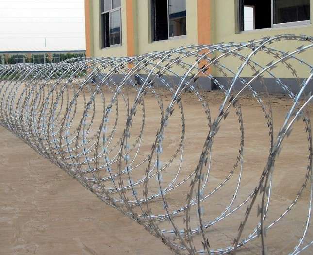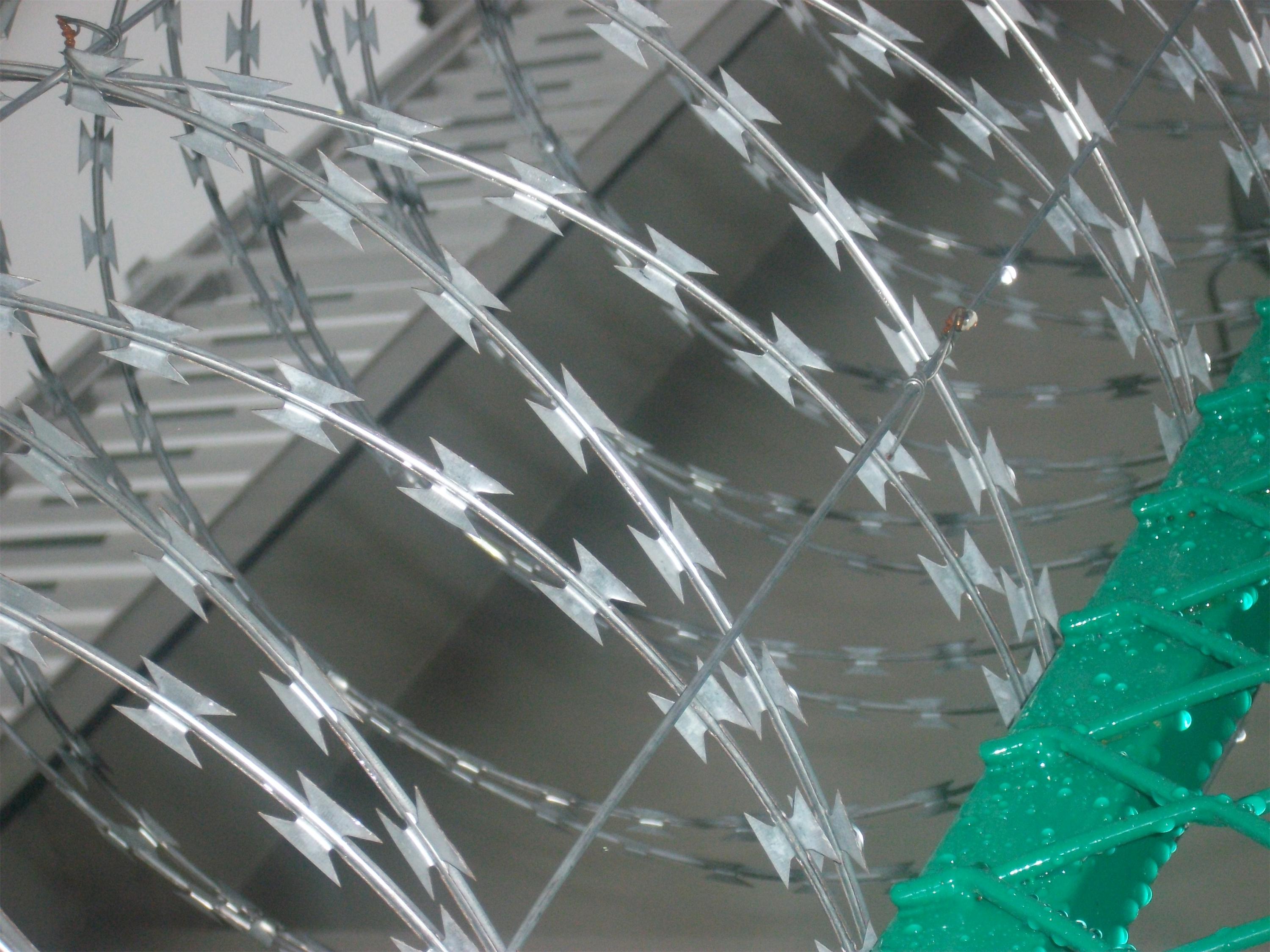 斧型刺刀圈的產(chǎn)品知識是一種新型防護(hù)網(wǎng),由銳利尖角刀片和芯線組成,刀刺、刀型整文、刀片銳利、排列均夕致密、連接牢固。強(qiáng)度和安全防御性級別很高,鋼筋網(wǎng)圍界刺鋼絲采用斧型刺刀圈,刺刀圈內(nèi)芯為直徑2.5mm的冷拔低碳鋼絲并經(jīng)防腐處理,表面熱鍍鋅。安裝刺刀圈與頂部V形延伸警用不銹鋼卡子連接,沿長度方向每隔500mm設(shè)4個卡子連接,拉強(qiáng)度大于1450N/mm,特點(diǎn):刀型整齊斧型刺刀圈規(guī)格: 刀片為BTO-22刀型,直徑為50、60cm、70cm,刀片鋒利,排列均勻、致密,連接牢固,防腐能力強(qiáng)、可達(dá)到防翻躍、防拆卸高安全防護(hù)等級。