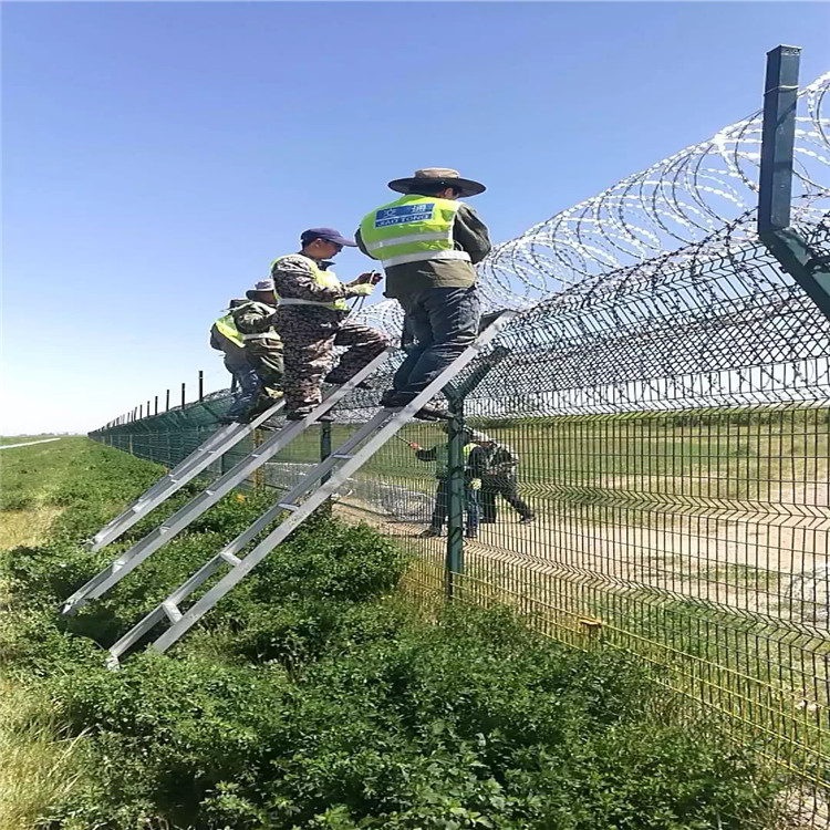 機(jī)場(chǎng)圍界是將機(jī)場(chǎng)飛行控制區(qū)與外界隔離的一道空防安全屏障,機(jī)場(chǎng)圍界通常由鐵柵欄或鐵絲網(wǎng)圍成,它擔(dān)負(fù)著保障飛行控制區(qū)安全的重任。圍界圍欄形式采用鋼筋網(wǎng)結(jié)構(gòu)形式,機(jī)場(chǎng)圍界又稱作“Y型安全防御護(hù)網(wǎng)”,是一種框網(wǎng)結(jié)構(gòu),由折彎網(wǎng)片,V型支架立柱,加強(qiáng)型焊接片網(wǎng),上面有刀片刺繩(又稱刀刺網(wǎng),刀片護(hù)網(wǎng))安全防盜連接件組成強(qiáng)度和安全防御性級(jí)別很高。框網(wǎng)結(jié)構(gòu)能夠提供更堅(jiān)固的支撐和更牢固的連接,難以被破壞??蚓W(wǎng)的結(jié)構(gòu)能夠有效地防止通過撞擊、破壞或攀爬等方式跨越,也能提供更好的視野和通風(fēng)效果。
