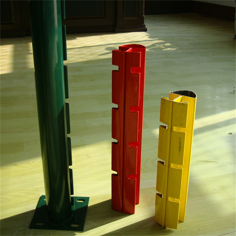 桃型柱護(hù)欄網(wǎng)一般采用桃型立柱與折彎網(wǎng)片(兩道折彎、三道折彎或四道折彎、折彎處加加強(qiáng)筋)搭配、所以又稱為折彎護(hù)欄網(wǎng)。桃型柱是通過機(jī)器冷壓、冷彎成型。柱體外側(cè)為橢圓型,內(nèi)側(cè)兩板相接后均各自向外彎制成U型,即為掛鉤部分。為便于桃型立柱與網(wǎng)片的連接,立柱內(nèi)側(cè)根據(jù)網(wǎng)片的網(wǎng)孔尺寸,延立柱長度方向均勻的設(shè)置N組鉤掛缺口分布于柱體兩側(cè),掛鉤U型的外部與外側(cè)的橢圓形柱體的直邊相切,有效地防止被撬開,保證了護(hù)欄的防撬安全性能。
