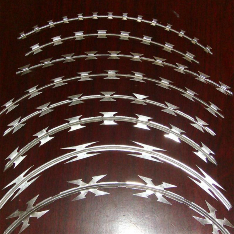 刀片刺網(wǎng)大概分為螺旋型、直線型、螺旋穿插型三種方式,刀片刺網(wǎng)由熱鍍鋅鋼板或不銹鋼薄板沖壓出尖利的刀片狀,高張力鍍鋅鋼絲或許不銹鋼絲做芯線組合而成的阻絕器件。由于刺網(wǎng)造形共同不易接觸,因而能到達極好的防護阻隔作用。產(chǎn)品的主要原料有鍍鋅板和不銹鋼板。刀片刺繩依照安裝辦法不同可分為:(蛇腹式)螺旋式刀片刺繩,直線型刀片刺繩,平板式刀片刺繩,刀片刺繩焊接網(wǎng)等。