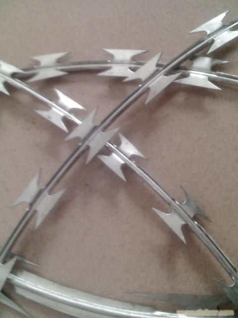 刀片刺絲網(wǎng)是一種新型防護(hù)網(wǎng),該產(chǎn)品具有防阻效果好。美觀,施工便利,經(jīng)濟(jì)實(shí)用等優(yōu)異特點(diǎn)。主要用于園林公寓,機(jī)關(guān)單位,監(jiān)獄哨所,邊防等圈禁防護(hù)。