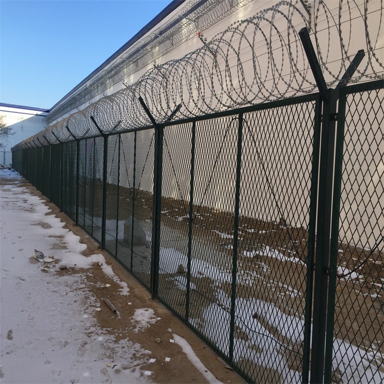 監(jiān)獄鋼網(wǎng)墻也叫Y型安全防御網(wǎng),是由V型支架立柱、 加強(qiáng)焊接網(wǎng)片、防盜連接件和熱鍍鋅蛇腹式刺絲滾籠組成的安全防護(hù)性能很高的護(hù)欄