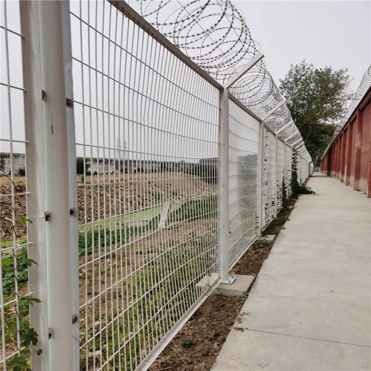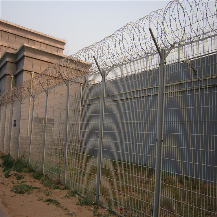 接下來是監(jiān)獄隔離網(wǎng)的網(wǎng)片和立柱的固定,用配套的防盜螺栓和用的安裝扳手,是安裝工作變得得心應(yīng)手。然后是蛇腹形刀刺網(wǎng)的架設(shè),立柱頂部的V型支架兩個側(cè)臂都焊接有專用的刺網(wǎng)鉤,每一側(cè)架三道鋼絲,形成一個V型槽,然后把刀刺網(wǎng)放到上面,再用專門的不銹鋼卡扣把鋼絲和刀刺網(wǎng)卡在一起,這樣就完成了整個監(jiān)獄隔離網(wǎng)的安裝。