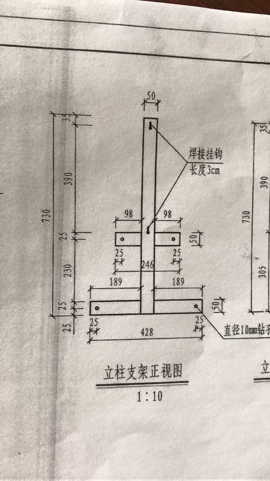 土字支架采用50mmx30mm,壁厚2mm高度是730mm、q235矩形鋼管和寬50mm,厚度4.5mm,長(zhǎng)度分別為246mm和428mm的兩塊Q235鋼板焊接制作,矩形鋼管上部焊接掛鉤采用長(zhǎng)度30mm的φ5mm鋼筋制作,加密支架采用50mmx30mm壁厚2mmQ235矩形鋼管制作??v向拉筋、冷拔鋼絲、支架抱箍、支架等均需要熱鍍鋅處理,鍍鋅量270克/㎡。