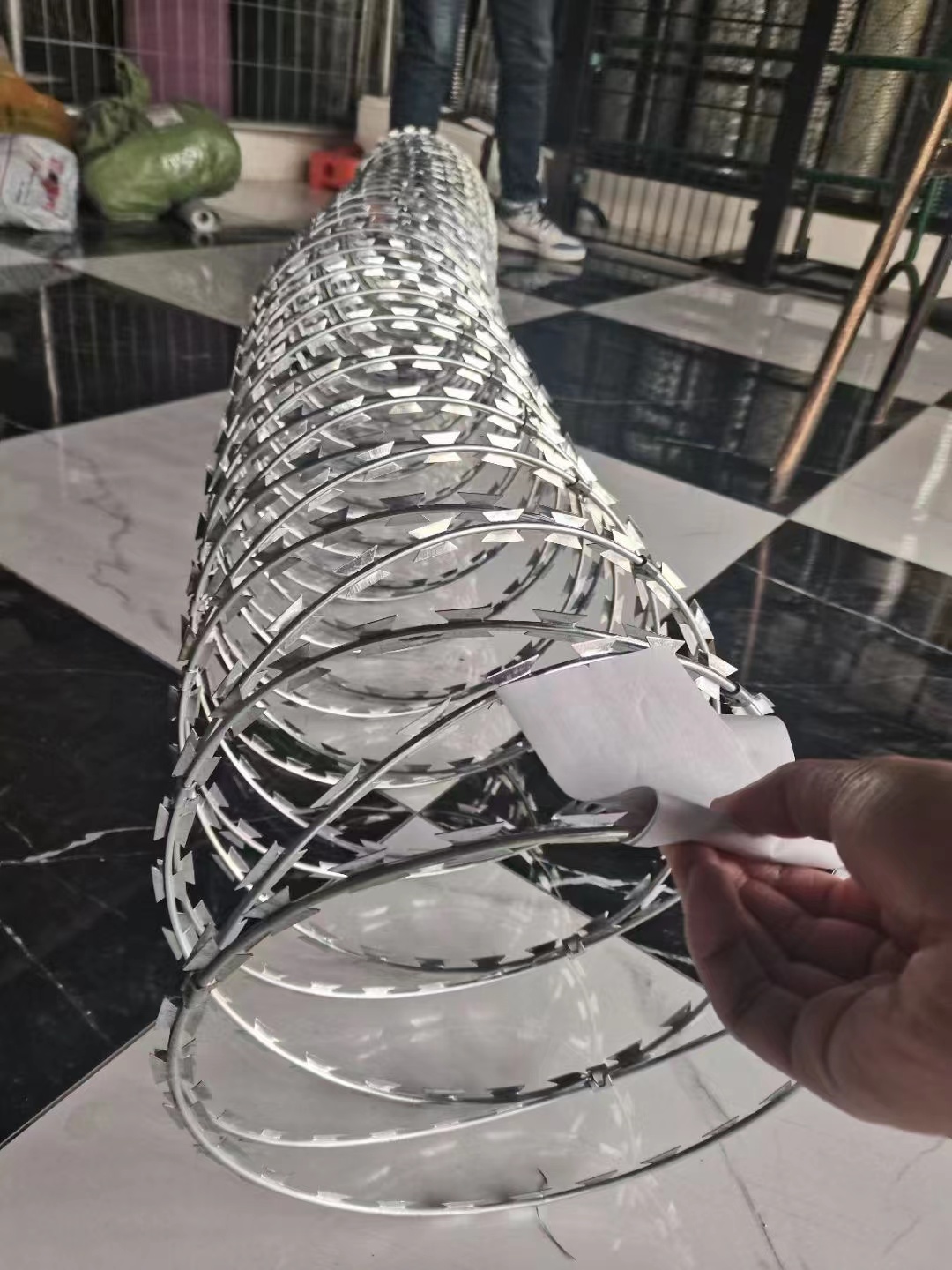 規(guī)格:排列密度不小于10圈 /m,相鄰每圈間距不大于100mm;刀刺網(wǎng)刀片為不銹鋼/鍍鋅板沖壓的尖銳菱形,長度22mm,寬度1 5rm,厚度0.5mm;芯線為不銹鋼絲/鍍鋅絲,線徑不小于2. 5mm,刀剌網(wǎng)與V型托架采用3道固定拉絲均勻固定,,扎絲采用1.2m不銹鋼絲/鍍鋅絲,固定拉絲采用8號鍍鋅鐵絲。