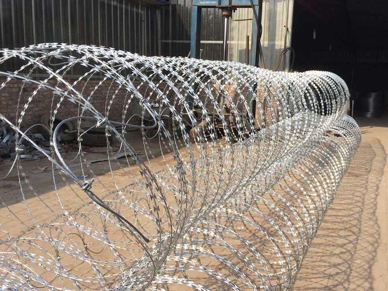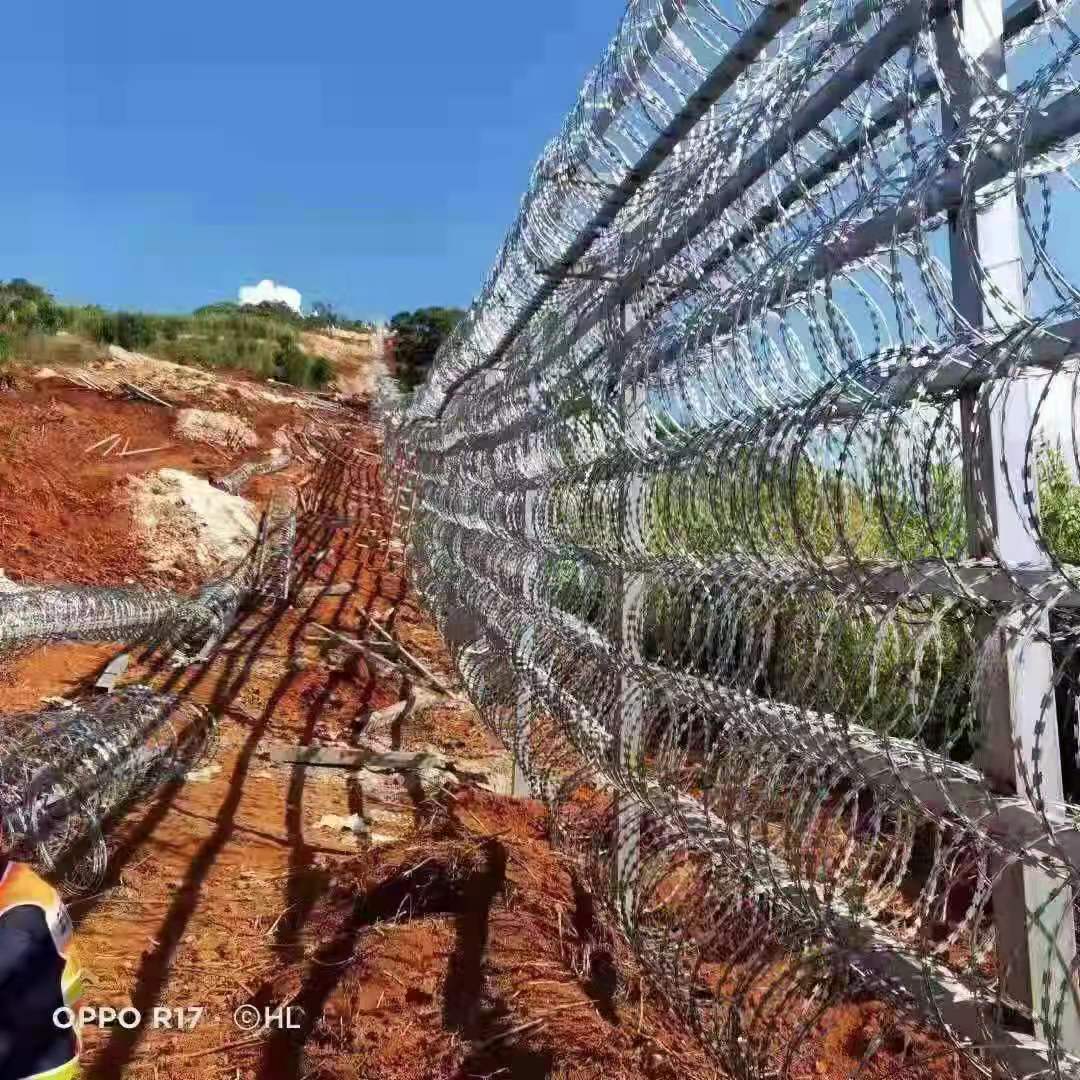 一圈一圈鐵絲上有鋒利的小刀片,強(qiáng)闖的話(huà)會(huì)在皮膚上劃開(kāi)很多小口,不及時(shí)救治就會(huì)傷口感染、嚴(yán)重的是流血過(guò)多而死。一般情況下,想要快速通過(guò)這個(gè)鐵絲網(wǎng),需要使用爆破筒,但是這會(huì)驚動(dòng)邊防官兵。用鉗子慢慢剪也可以,但是監(jiān)控設(shè)備和無(wú)人機(jī)會(huì)發(fā)現(xiàn)。而且我國(guó)的蛇腹型鐵絲網(wǎng)是立在柵欄上面的,剪的話(huà)會(huì)很難操作,耗時(shí)耗力