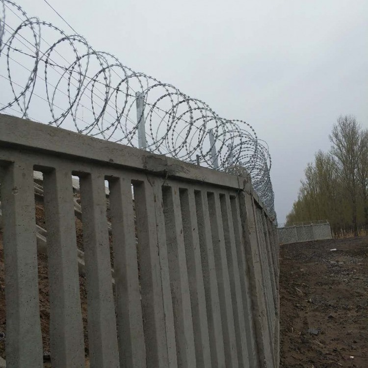 鐵路專用刺絲滾籠設(shè)置規(guī)范:鐵路專用刺絲滾籠采用刀片刺繩繞圈后相臨兩圈每隔120”用刺絲連接卡固定,張開后形成蛇腹網(wǎng)狀,閉合后刀片刺繩圈徑為500mm,張開后每交叉圈安裝間距200mm,直徑不小于450mm。鐵路專用刺絲滾籠由刺絲連接卡扣與固定在支架上的縱向拉筋相連接,縱向拉筋與支架的連接采用02.5mm的冷拔鍍鋼絲繞2圈擰緊固定。鐵路專用刺絲滾籠刀片刺繩由沖切鋼板采用機(jī)械壓軋在鋼絲上成型,刀刺寬度22mm,兩刃垂直間距15mm,刀刺縱向間距34m,芯絲直徑為2.5mm。刀片采用厚度0.5mm。