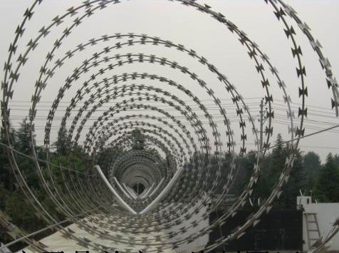 刀片刺繩的刀片是由尖利的鍍鋅鋼或不銹鋼制成。支架由相同規(guī)格的矩形鋼管制成。穿插環(huán)安裝相距20厘米,直徑至少為45厘米。刀片采用0.5mm厚Q195鋼板進(jìn)行模切,芯線為HPB300;采用6.5mm高線另一個(gè)跨度僅在列的頂部提供,并且支架和防護(hù)圍欄經(jīng)過支架環(huán)銜接。