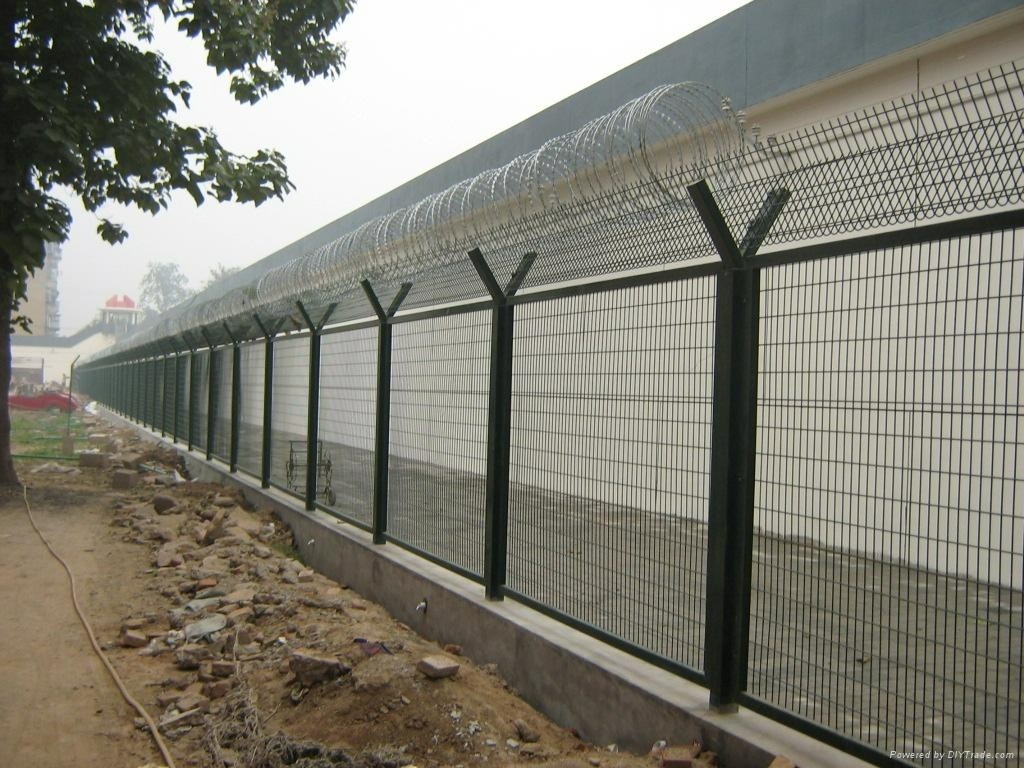 監(jiān)獄網(wǎng)墻設(shè)計(jì)要求:整體固定連貫一致,標(biāo)準(zhǔn)生產(chǎn)質(zhì)量,框網(wǎng)方正,對角線誤差不大于2cm。監(jiān)獄隔離網(wǎng)網(wǎng)面安裝離地距離5-8cm,框網(wǎng)與立柱采用螺栓固定邊耳式連接網(wǎng)頁每邊與立柱連接點(diǎn)不少于六處。立柱采用水泥澆灌預(yù)埋式,規(guī)格為600*600*600mm (長*寬*深),底座四角預(yù)制四個(gè)直徑25mm熱鍍鋅螺栓(每個(gè)螺栓中心為距基礎(chǔ)兩邊150mm的交叉點(diǎn)),從頂端往下絲長不小于150mm (與地籠焊為一體),螺栓高于底座平面50mm (底座平面應(yīng)與所在位置最終地面高度在同一水平高度),螺栓間距為300mm*300mm,與立柱法蘭盤螺孔相適應(yīng)。立柱保持豎直、不歪斜。立柱做調(diào)直處理,每20米校正,每100米偏差角度不大于5°,安裝整體無歪斜,隔離網(wǎng)整體呈直線(除地形需要做出適宜角度外)。