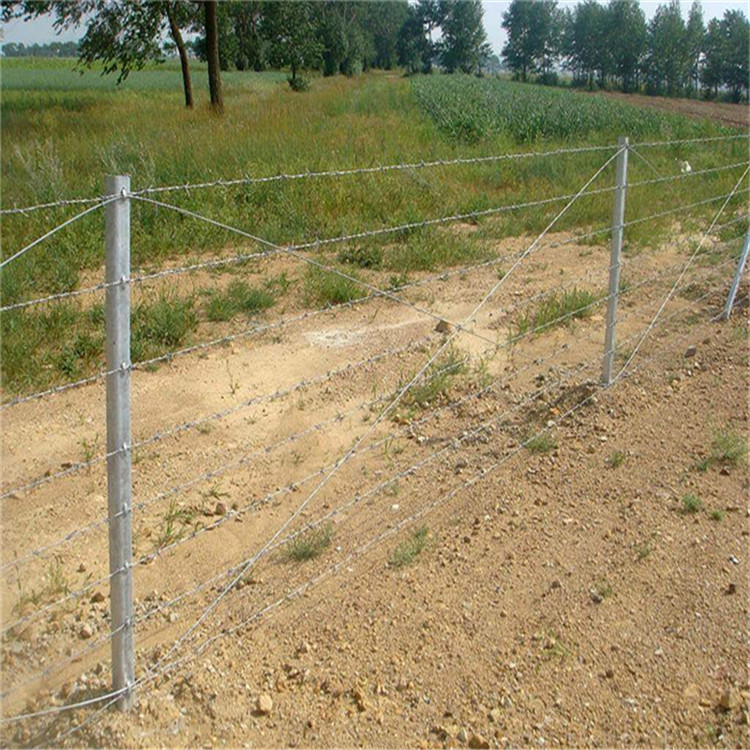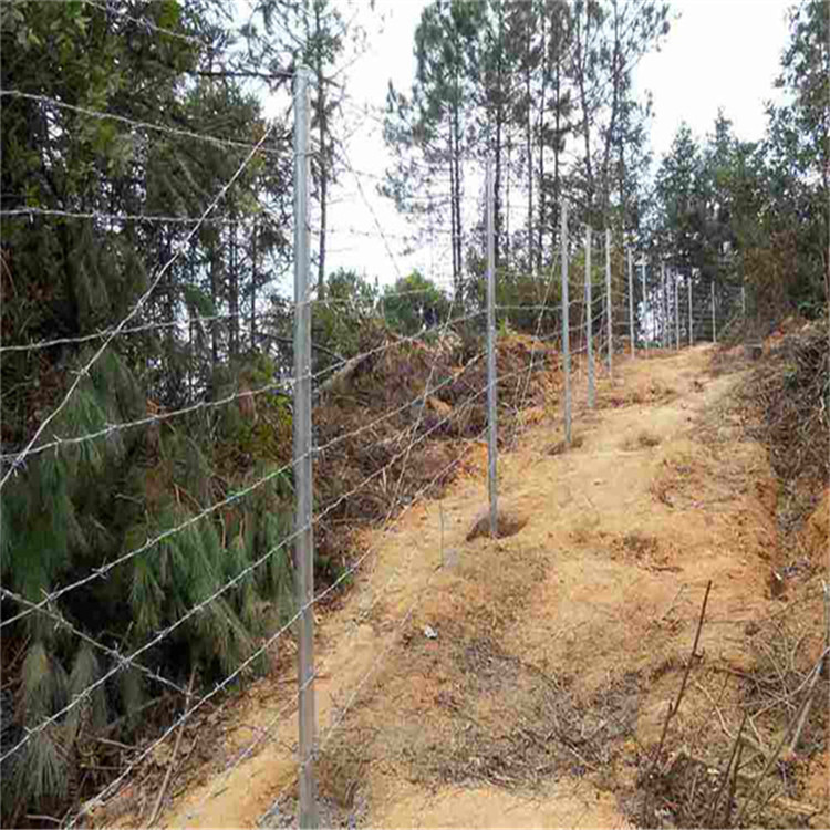 聯(lián)鋼絲、花蘭螺栓、綁扎鋼絲等組成。立柱采用槽鋼立柱,刺鋼絲網(wǎng)與槽鋼之間通過鋼掛鉤連接,鋼絲采用q2.5鋼絲,立柱間距為3米每隔30米設置一處兩向斜撐每隔90米設置一個三向斜撐。