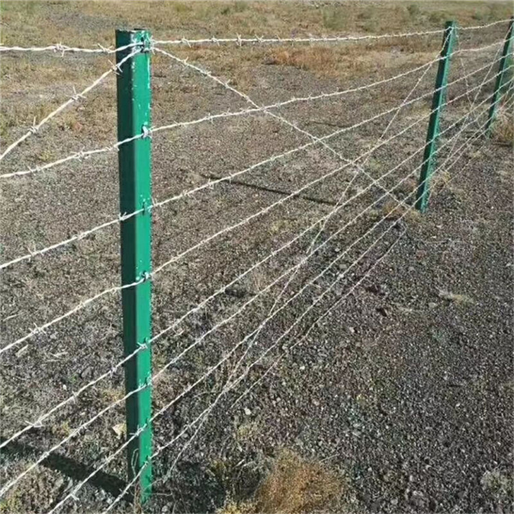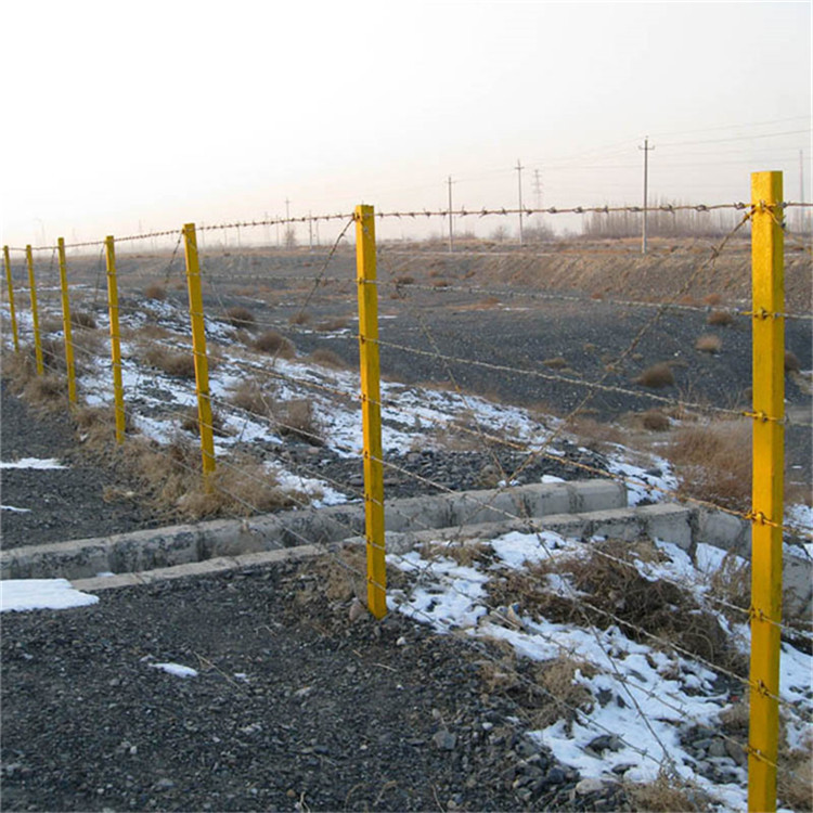 焊接網(wǎng)隔離柵由立柱、網(wǎng)片、斜支撐及緊固件等組成。每一卷焊接網(wǎng)長度為30米,刺線每捆165米,可根據(jù)實際情況隨意裁剪,這樣可以使隔離柵能夠在保證連續(xù)性的同時,仍能夠很好的與地面形狀相配合。焊接網(wǎng)的立柱采用異性鋼管立柱,間距為3.0米,每隔30米設置一個端頭立柱,并配合設置兩個斜支撐。網(wǎng)片與異型鋼管立柱之間采用高強不銹鋼絲進行連接。刺鋼絲隔離柵由立柱、斜撐、刺鋼絲、串
