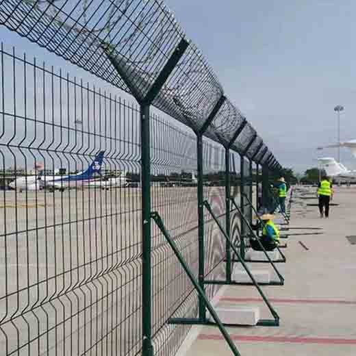 軍用機(jī)場和民用機(jī)場所用鋼筋網(wǎng)圍界的區(qū)別在樣式和用料上并沒有太大的區(qū)別。立柱都是用Y型立柱,上方安裝蛇腹型刀刺網(wǎng),網(wǎng)片都是低碳鋼絲焊接而成,區(qū)別也可在于有邊框和無邊框,軍用機(jī)場在絲徑的選擇上也可選擇絲徑較粗的絲徑,可保證機(jī)場的安全也可加強(qiáng)機(jī)場護(hù)欄網(wǎng)的防御能力,民用機(jī)場也有用邊框網(wǎng)片的。表面處理采用浸塑處理。一般民用網(wǎng)片就可做三道加強(qiáng)筋,軍用機(jī)場護(hù)欄網(wǎng)想要抗沖擊能力更強(qiáng),也可增加一條加強(qiáng)筋,抗沖擊力,和防御性能會更加強(qiáng)勁。
